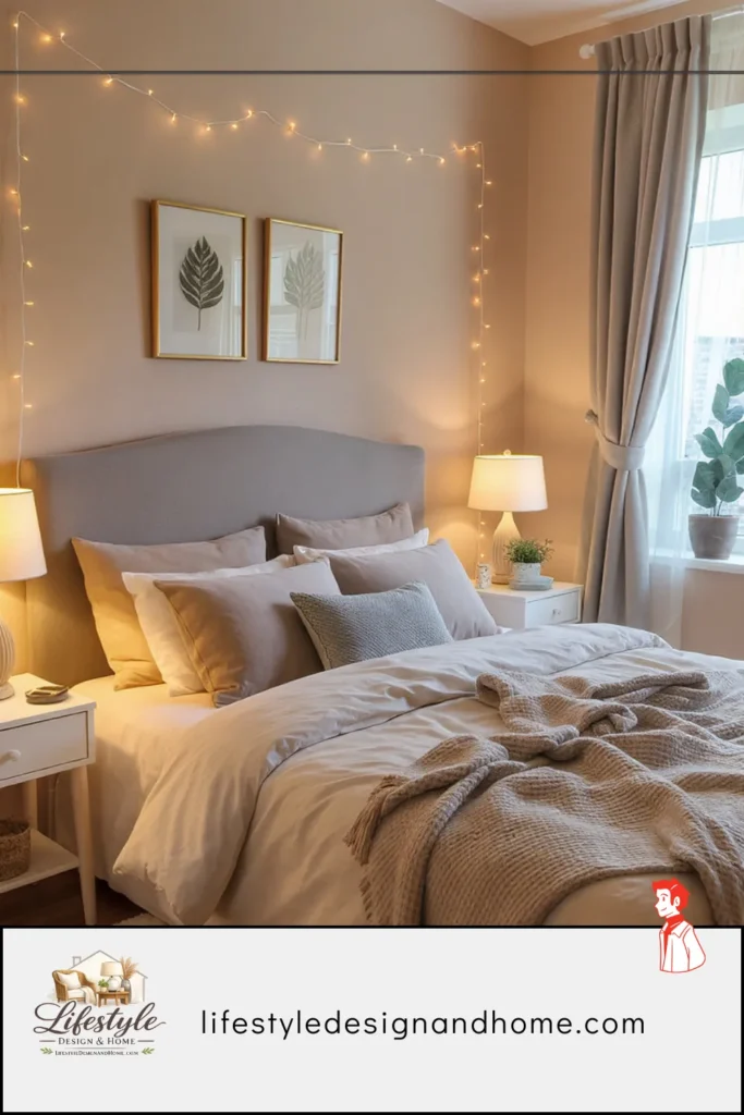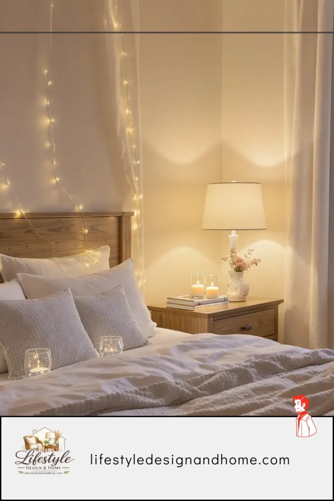 String lights behind the headboard: A strand of warm string lights tucked behind or along the top of the headboard creates a halo of warm light around the bed that is, in my opinion, one of the most romantically effective bedroom lighting moves available at low cost. The light is indirect — you see the glow, not the source — and the warmth it adds to the headboard area transforms the bed from furniture to destination.