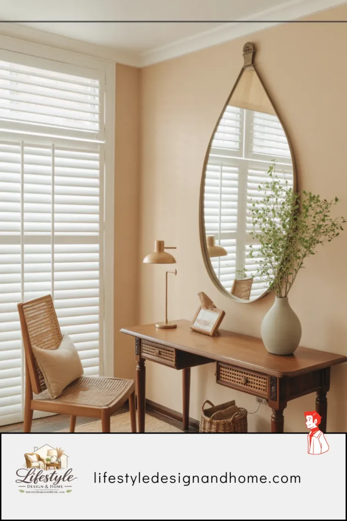 The position that works best in small rooms: directly opposite the room’s primary light source — the window during the day, the primary lamp source in the evening. A mirror on the wall opposite the window reflects the window back into the room, creating the impression of a second window. The room doubles its apparent natural light. The brain processes two windows and estimates a room large enough to have two walls with windows.