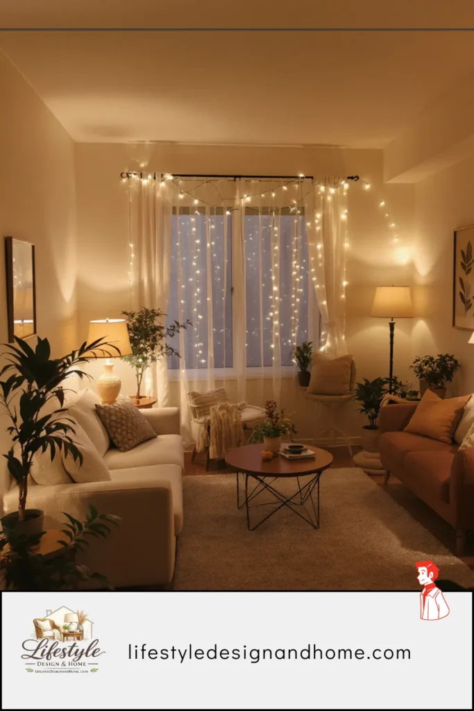 I replaced this with layered warm sources. Not replaced the fixture — I kept it, on a dimmer, used at 20 percent in the evening as background ambient light. What I added was a floor lamp in the corner farthest from the window (warm shade, torchiere style, 2700K bulb), a small table lamp on the side table beside the sofa (cream shade, 2700K), and candles on the coffee table on evenings when the room was being used for anything beyond passing through.